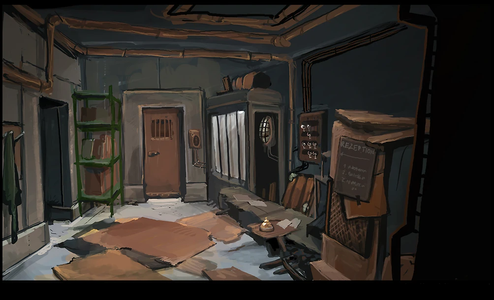 - Первоначально многие (если не все) помещения отеля кардинально отличались от показанных в игре: Ранний отель имел более строгий дизайн, чем его конечная вариация. В ранних концепт артах Менетекл был более закрытым, а туалет находился не чуть ниже жилой зоны, а на несколько десятков метров ниже и к нему вела лестница. Так же видно, что рецепция и буфет соединялись всего одним путем, а не двумя, как это было в игре, так же не до конца понятно, как при старом дизайне рецепции мог быть осуществим трюк с часами. Так же, глядя на ранние концепты, можно предположить, что в отеле должно было быть 3 жилых номера, а не 4, как это было в конечной версии Отеля, четвертый номер был завален хламом.